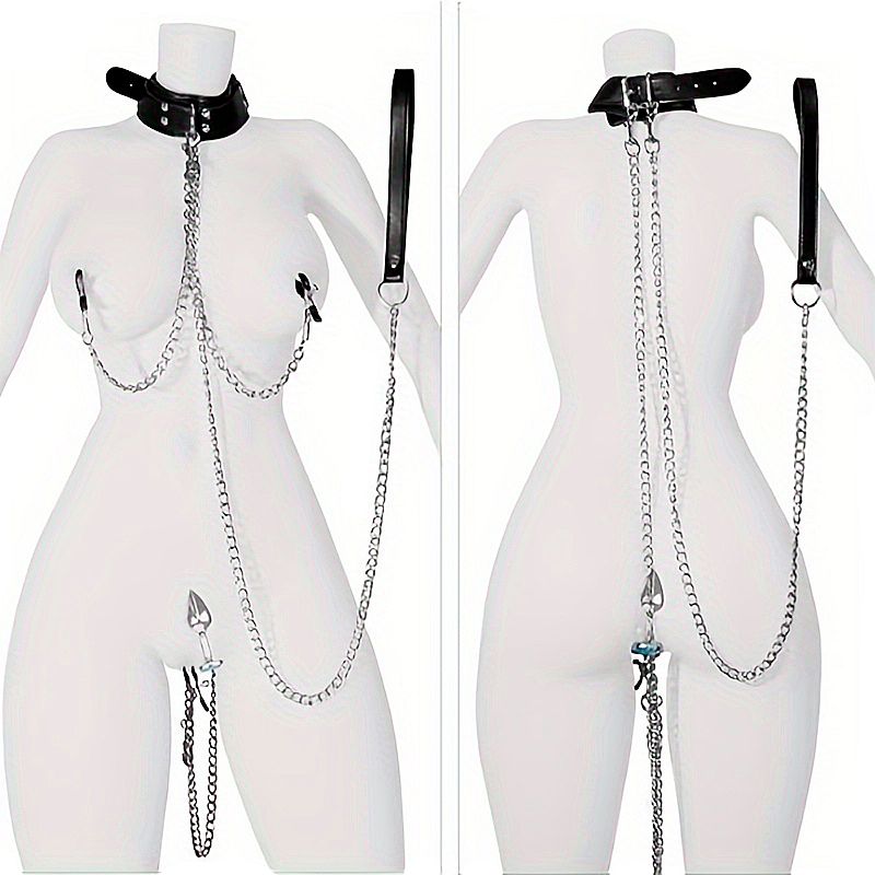Coleira bondage com grampo de mamilo e plug anal, ajustável por meio de fivelas metálicas, confeccionada em couro sintético.