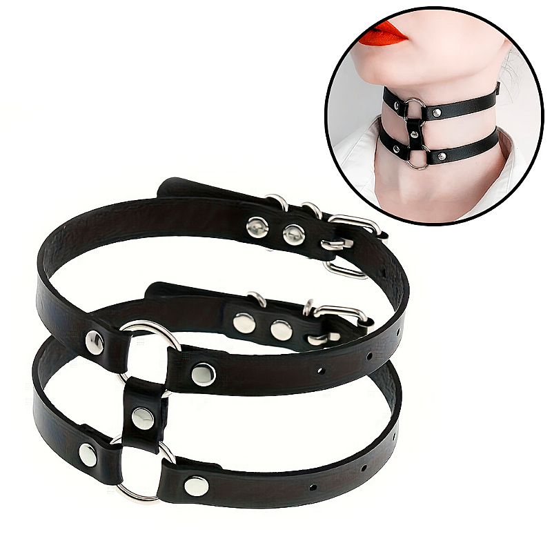 Coleira bondage ajustável por meio de fivelas metálicas, confeccionada em couro sintético.