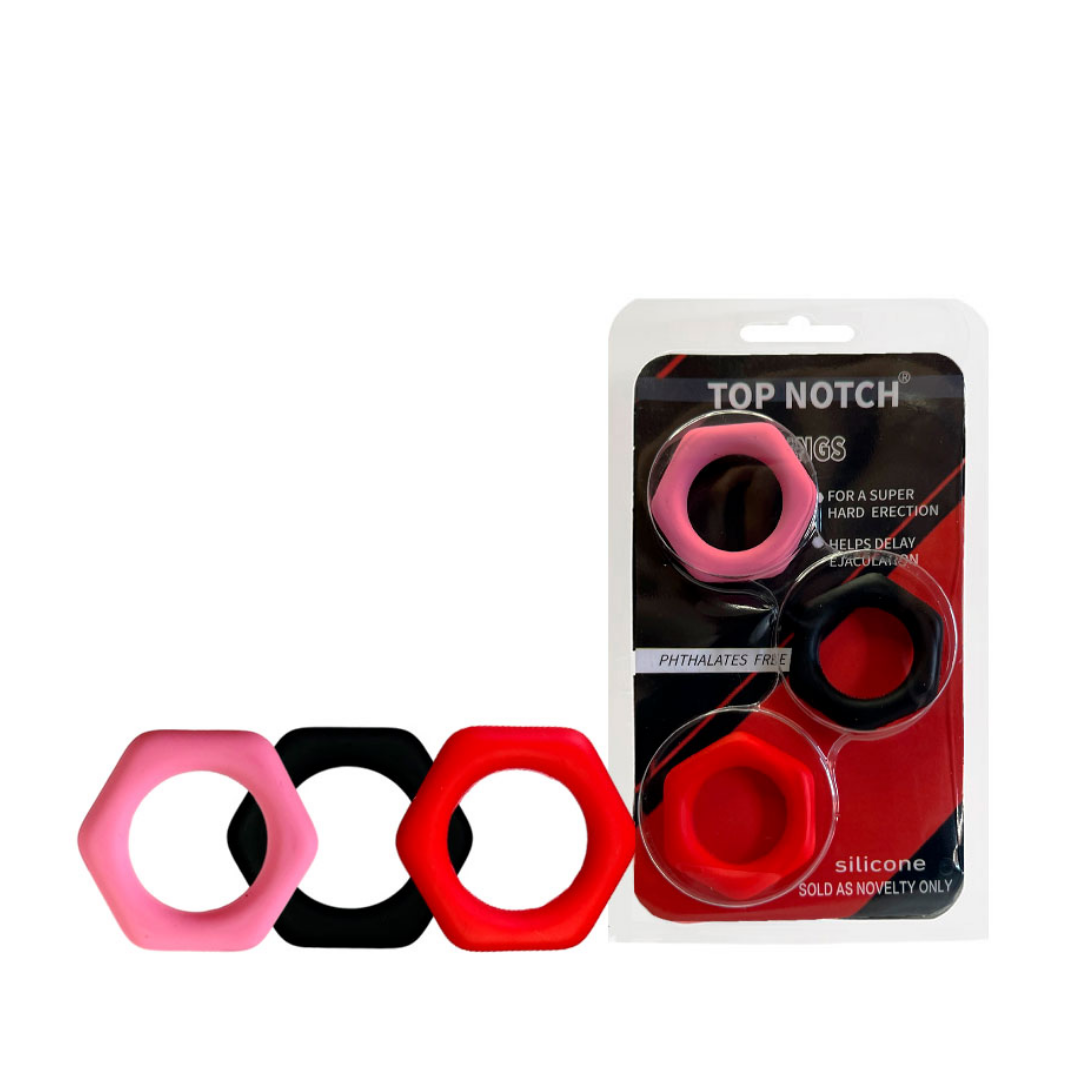 Kit com 3 anéis penianos formato hexagonal.